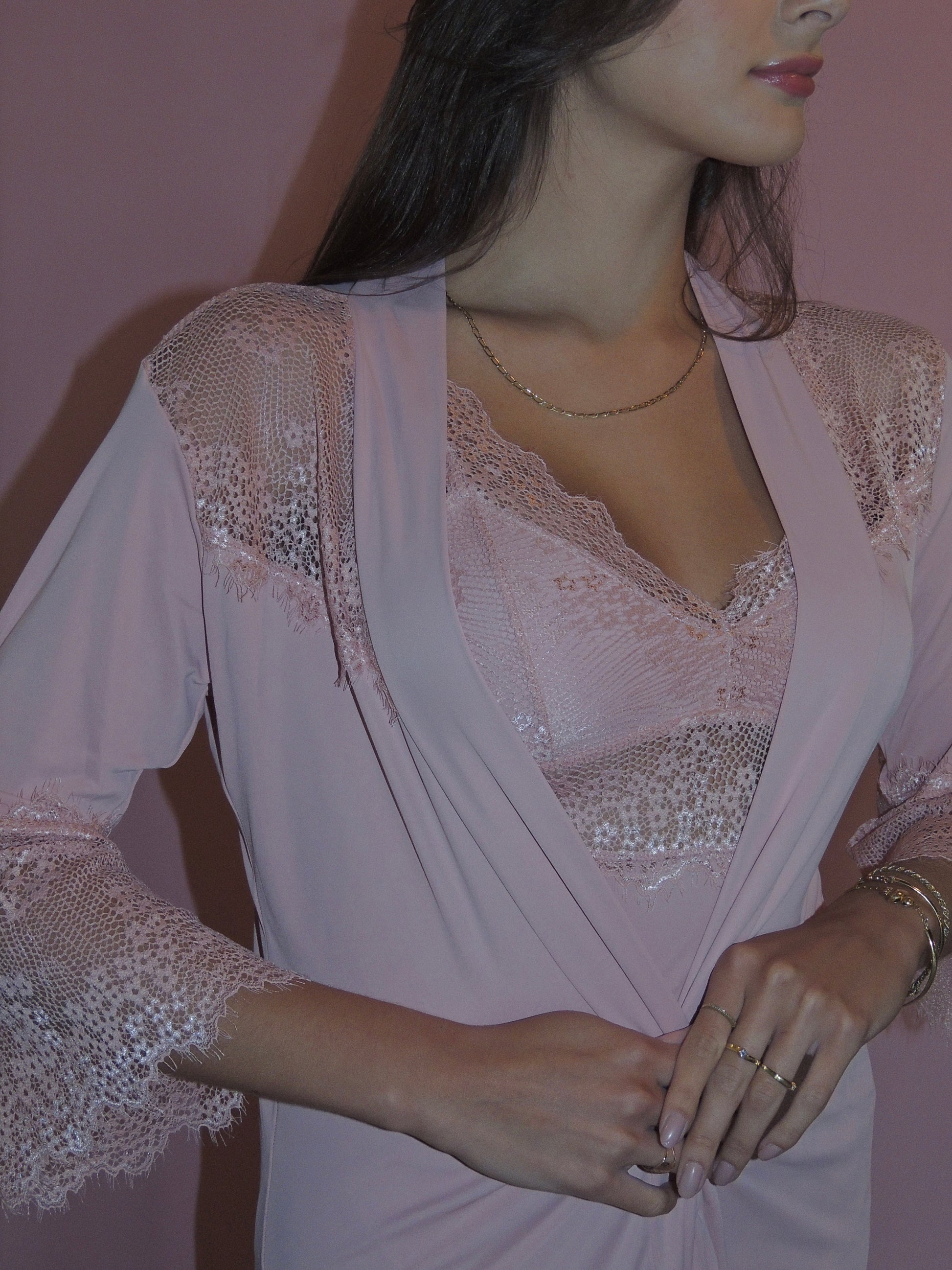 recorte logo abaixo do busto. O robe acompanha a mesma proposta, com mangas ¾ e